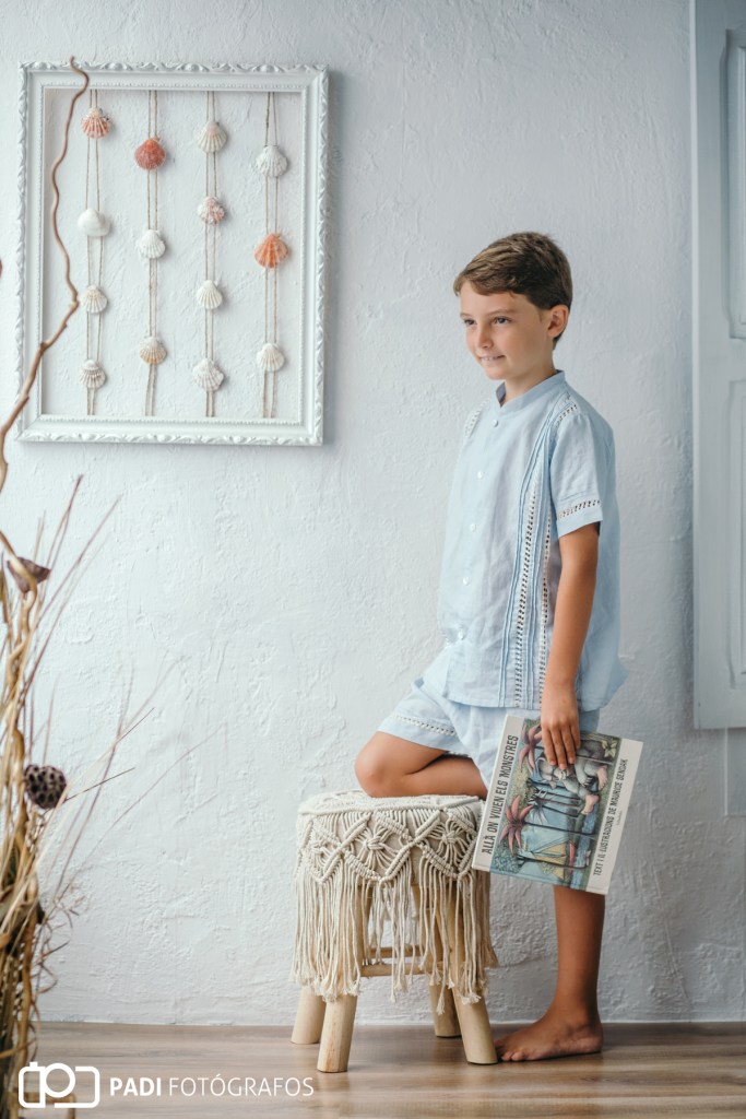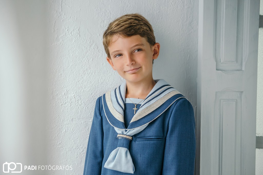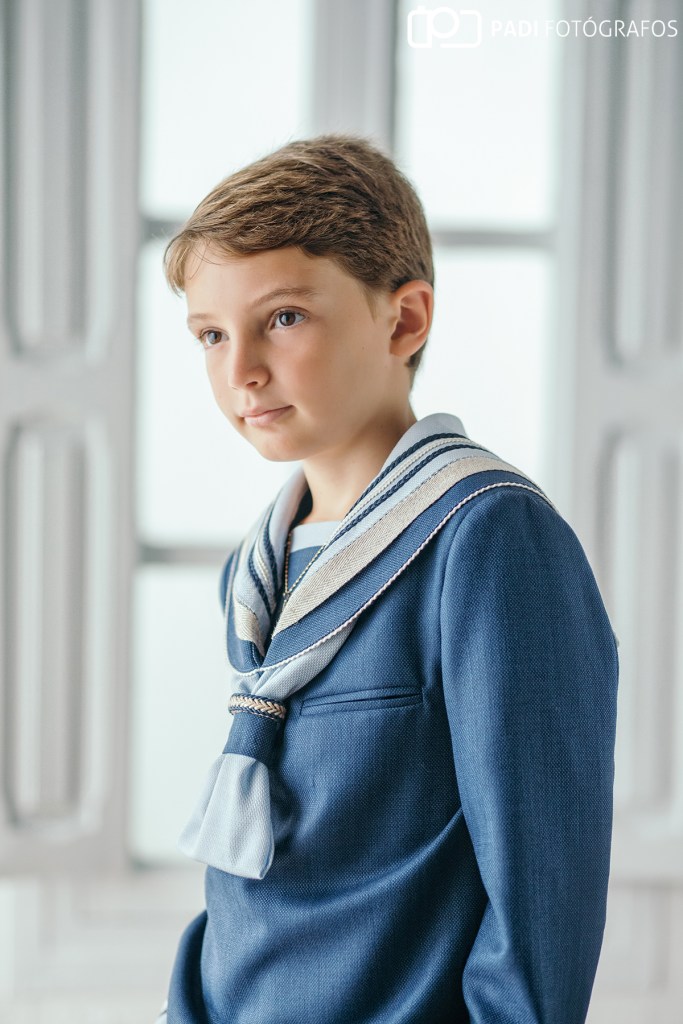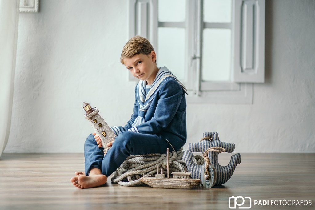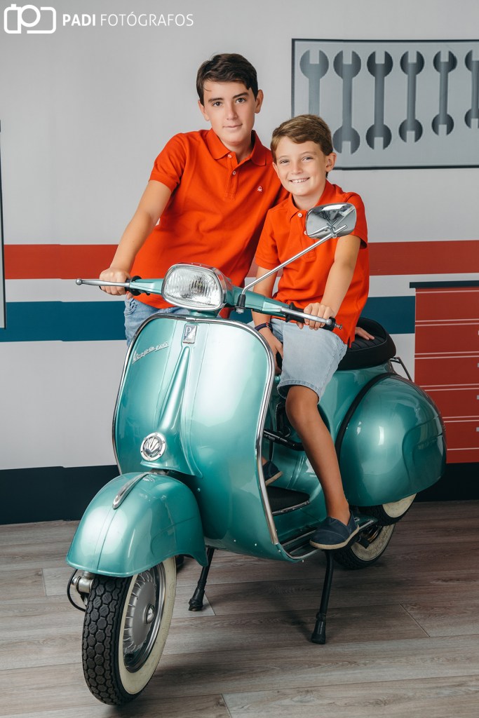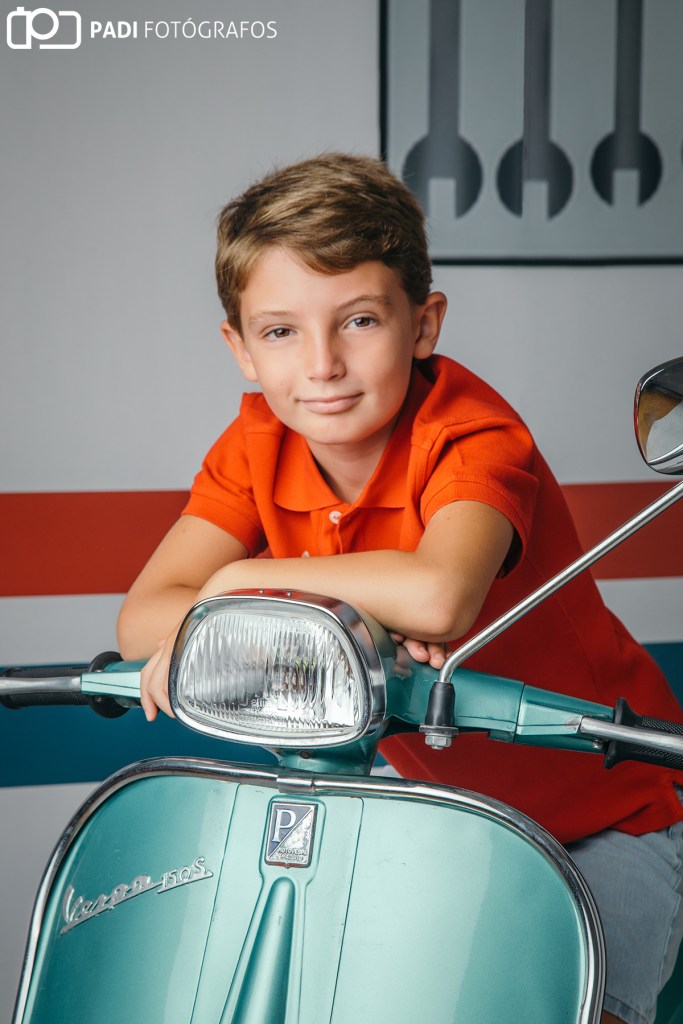 Pero unos días antes hicimos las fotografías de comunión en el estudio, Bruno iba muy elegante con su traje de comunion de marinero azul marino,también hicimos con su hermano Mauro con una ropa más sport con nuestra vespa clásica en nuestro decorado de taller mecánico y una última sesión con el clásico pijama.